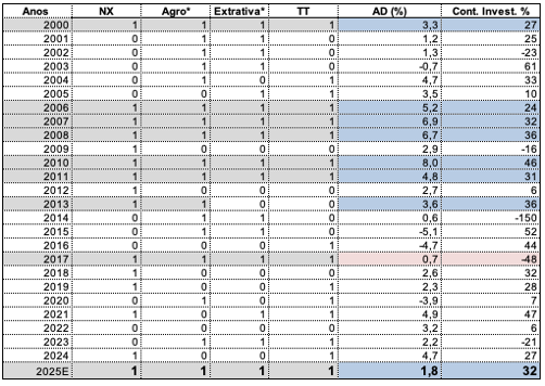 Tabela 1: Contribuição externa negativa para o NX (1=negativo e 0=positivo), crescimento positivo (1) ou negativo (0) da agropecuária, da indústria extrativa e dos termos de troca, taxa de crescimento da absorção doméstica e a contribuição do investimento para a crescimento da absorção doméstica (2000-2025)