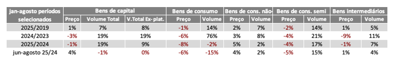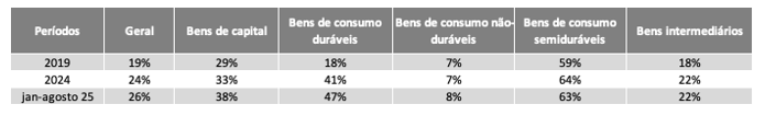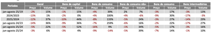 Tabela 2: Taxa de média de crescimento acumulado no ano (janeiro-agosto) do quantum e do Isso se reflete na redução do quantum importado de bens de consumo também: entre janeiro e agosto de 2025, houve recuo expressivo no ritmo de crescimento do quantum importado de bens de consumo em todas as categorias de uso em relação ao mesmo período anterior: -2%, 2% e 17%, respectivamente, em duráveis, não-duráveis e semiduráveis. É importante ressaltar que entre janeiro e agosto de 2024, em relação a 2023, o crescimento foi 76%, 8%, 21%, respectivamente.