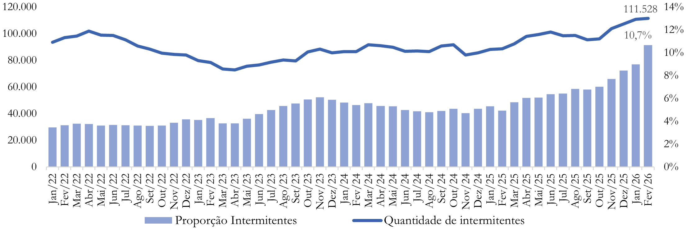 O Gráfico 2 ilustra a evolução desse tipo de contratação no Brasil, considerando o saldo acumulado em 12 meses móveis entre janeiro de 2022 e fevereiro de 2026: a linha azul representa o saldo absoluto, enquanto as barras indicam sua participação percentual no total de empregos formais. Observa-se uma trajetória de crescimento desde 2023, com aceleração mais intensa nos meses recentes. O pico foi registrado no período entre março de 2025 e fevereiro de 2026, quando o saldo alcançou 111.528 postos, o maior valor desde o início do Novo CAGED, em 2020. No mesmo intervalo, a participação do trabalho intermitente chegou a 10,7% do total de empregos formais, também o maior patamar desde o início de 2021.