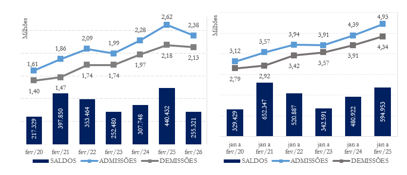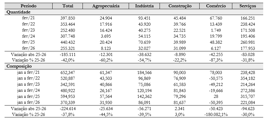 Fonte: Elaboração das autoras com base nos microdados do Novo CAGED. Dados com ajustes declarados até fevereiro de 2026.