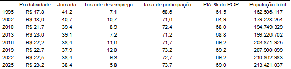 Da segunda até a sexta coluna, são reportadas estatísticas de mercado de trabalho e demográficas. Na segunda, a jornada de trabalho, medida pelo número de horas trabalhadas por semana em média por um trabalhador ocupado. Na terceira coluna, a taxa de desemprego. A taxa de desemprego é dada pela razão entre a população desempregada, isto é, que não trabalha e procura emprego, e a população economicamente ativa (PEA). Na quarta coluna, a taxa de participação, que é a razão entre a PEA e a população em idade ativa (PIA). A PEA é a razão entre a soma da população empregada com a desempregada e a população em idade ativa (PIA). Na quinta coluna, temos a PIA como proporção da população total (POP). A PIA é a população com idade entre 15 e 64 anos. Finalmente, na última coluna, temos a evolução da população total do Brasil.