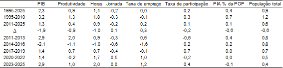 O crescimento médio de 2,3% nos últimos 31 anos foi composto por 3,2% nos 16 anos de 1995 até 2010 e 1,3% de 2011 até 2025. A queda de 1,9 ponto percentual (3,2-1,3) é decomposta em queda de 0,9 ponto percentual (pp) da produtividade e de 1 pp da taxa de crescimento das horas trabalhadas. Entre os dois períodos, houve queda de 0,6pp na taxa de crescimento da PIA como fração da população total, sinalizando o esgotamento do bônus demográfico, e de 0,6pp na taxa de crescimento populacional. A produtividade cresceu muito pouco nos 15 anos entre 2011 e 2025. Cresceu somente 0,4% por ano.