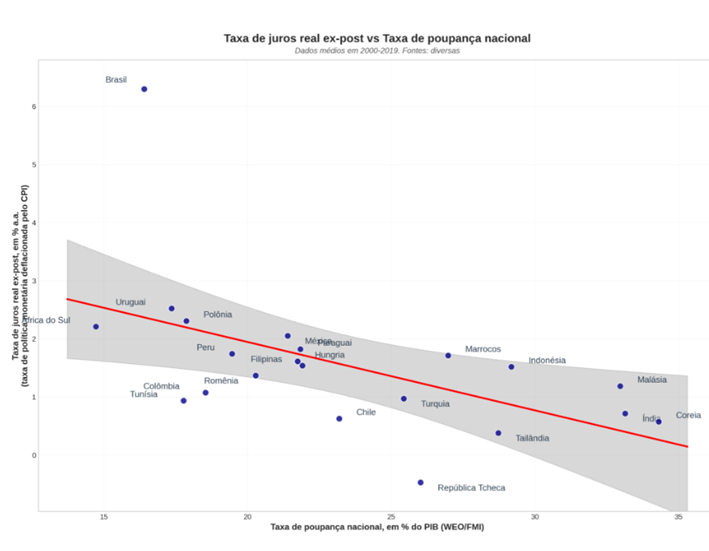 Como pode ser notado, de fato há uma relação negativa entre a taxa de poupança doméstica/nacional e o patamar de juro real, como sugere a teoria econômica. Contudo, as figuras indicam que o Brasil é claramente um outlier, uma aberração: países com taxas de poupança semelhantes à nossa, como Uruguai e África do Sul, apresentaram taxas de juros reais muito menores do que a brasileira.