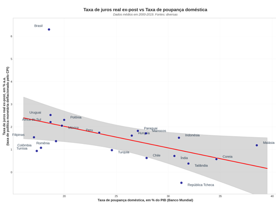 De fato, há a relação negativa entre a taxa de poupança doméstica e o patamar de juro real, como sugere a teoria econômica. Mas, mesmo considerando esse fator, exercício sugere um “excesso de juros” no Brasil de quase 4 pontos percentuais.