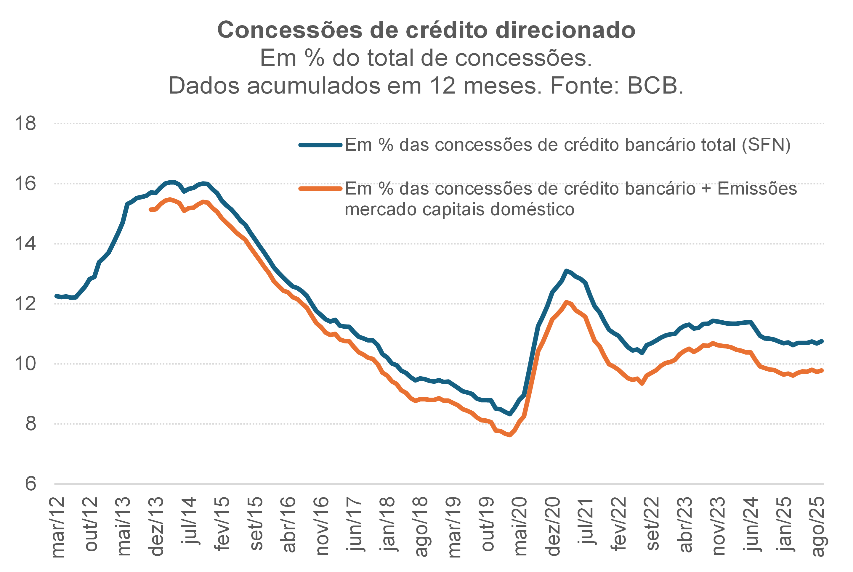 Algumas explicações mais recentes vêm enfatizando a baixa potência da política monetária brasileira, por diversas razões, tais como o spread bancário muito elevado (um dos maiores do mundo) e a presença relevante de crédito direcionado - que, no entanto, está hoje bem abaixo dos picos atingidos há uma década, como aponta a figura abaixo[1]. Um estudo recente feito na Europa, usando microdados de contratação de crédito por firmas, dá suporte empírico a uma tese defendida pelos “heterodoxos” no Brasil há tempos: quanto maior o percentual de empréstimos às empresas com juros pós-fixados, menor a potência da política monetária, já que um eventual aumento da taxa básica de juros, ao elevar os custos das empresas, é repassado, integral ou parcialmente, aos preços dos produtos.