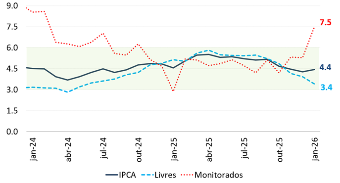 A inflação permaneceu quase todo o ano fora da banda de tolerância do regime de metas, cumprindo o regime somente ao final de 2025. Confirmando a nossa expectativa ao final de 2024, o IPCA ficou consistente acima de 4,5% (o limite superior da banda de tolerância inflacionária) durante grande parte de 2025, configurando infração formal do regime de metas em meados do ano. Ainda que o IPCA tenha mostrado trajetória declinante a partir do 4º trimestre, a inflação só voltou para a banda ao apagar das luzes de 2025, encerrando o ano em 4,26%. O comportamento dos preços trouxe inúmeras divergências em 2025, com dicotomia entre preços livres e administrados (gráfico 6) e, dentro dos preços livres, entre alimentos, bens e serviços. Importa notar que a inflação acumulada em 12 meses voltou a acelerar no início de 2026, mas estritamente devido a uma base comparativa desfavorável.