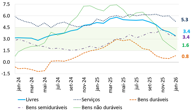 A composição da inflação importa, lançando dúvidas sobre a consistência do processo de redução do crescimento dos preços. Focando a análise nos preços livres, resulta claro que a descompressão inflacionária do final de 2025 ficou concentrada em categorias específicas, com destaque para bens duráveis e, principalmente, não duráveis – por excelência, alimentos (gráfico 7). A inflação de serviços, mais inercial e ligada ao ciclo monetário, acelerou no decorrer de 2025, encerrando o ano em 6,0%. Mesmo que tenha ocorrido descompressão no início de 2026, o seu patamar continua inconsistente com um recuo perene da inflação. Mesma conclusão pode ser observada nos núcleos de inflação e nos indicadores de difusão inflacionária: a incipiente redução da inflação, ao final de 2025, não foi particularmente robusta.