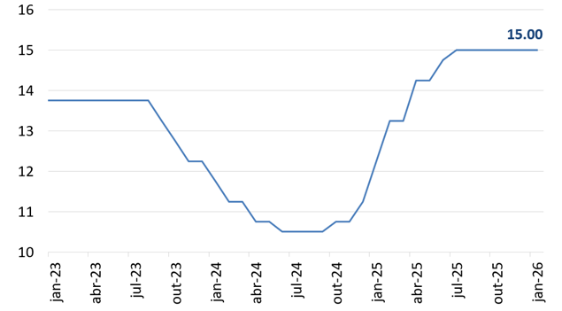 Gráfico 8: Taxa Selic (%a.a., 2023-2025)