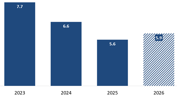 Gráfico 11: Taxa de desemprego (%, média do ano, 2023-2026(p))