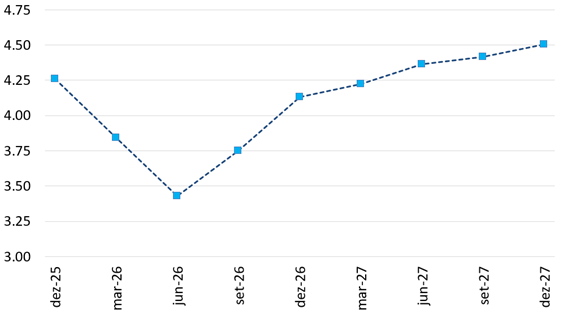 O ambiente não sugere espaço para uma grande flexibilização monetária. Entretanto, esperamos que a Selic recue para 12,00%a.a. em 2026. Em função de mudanças na sinalização do Banco Central, ocorridas na reunião do COPOM de janeiro de 2026, esperamos que o ciclo de flexibilização monetária comece ainda no 1º trimestre do ano, na reunião do COPOM de março. Em nossa visão, toda a narrativa de cautela foi posta em xeque quando a autoridade monetária reintroduziu o forward guidance, mesmo sob intensa incerteza, na primeira reunião de 2026. As justificativas apresentadas (redução da incerteza no curto prazo, desinflação corrente e fechamento da diferença entre as expectativas de mercado e a meta) nos pareceram extremamente frágeis, quanto mais se notarmos que tanto as projeções condicionais do BCB como as expectativas de mercado ainda se encontram acima da meta no horizonte relevante. Ocorreu uma “revelação de tipo”, com o Comitê abraçando uma avaliação dovish do cenário. Esperamos um ciclo de 300bps de flexibilização monetária, com 6 reduções consecutivas de 0,5p.p. na taxa básica, até atingir 12,00% na reunião do COPOM de novembro.
