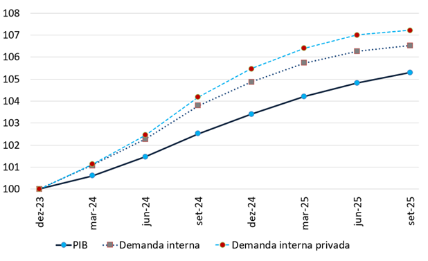 Gráfico 1: PIB vs. componentes da demanda interna (dez/23=100, ajustado sazonalmente)