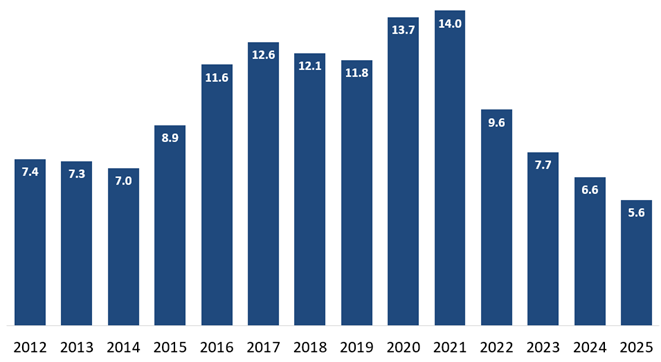 Gráfico 3: Taxa de desemprego (%, média anual, 2012-2025)