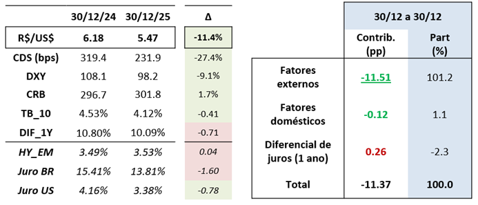 A taxa de câmbio registrou importante apreciação ao longo do ano, motivada por fatores externos. No que provavelmente foi a maior realização favorável de 2025, a taxa de câmbio registrou importante fortalecimento, saindo de R$ 6,18/US$ ao final de 2024 para R$ 5,47/US$ ao final de 2025 – exatamente o que descrevemos como nosso cenário otimista no início do ano passado. Note-se que a cotação chegou a registrar valores ainda mais fortes, em um máximo pouco abaixo de R$ 5,30/US$ em meados de novembro. Os estudos da BRCG apontam que a quase totalidade da apreciação cambial resultou de fatores externos (tabela 3), com notável participação do enfraquecimento global do dólar americano e da redução dos juros da Treasury americana de 10 anos. O movimento ocorreu em contexto de grande descompressão do risco-país em 2025, ocasionada em pequena parte por virtude doméstica e muito devido à descompressão externa. Foi uma notável onda favorável, surfada por diversas moedas emergentes, dentre elas o Real.