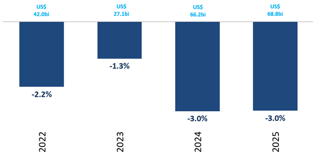 Gráfico 5: Déficit em conta corrente (% do PIB e US$bi, 2022-2025)