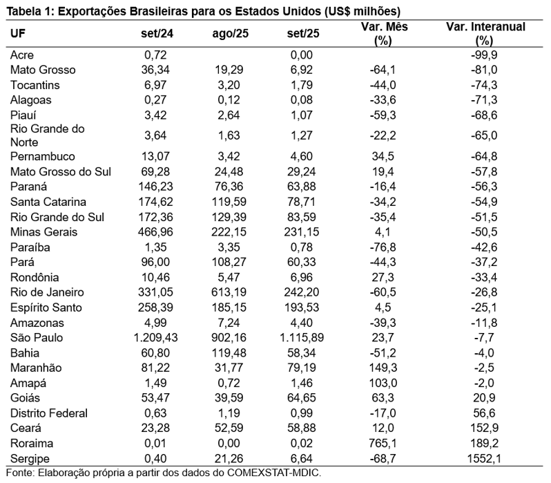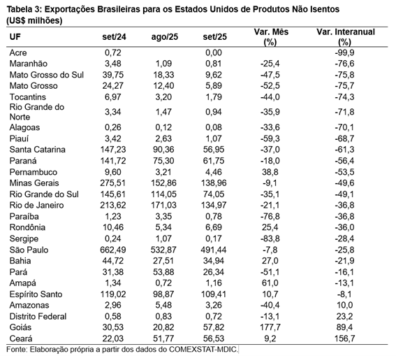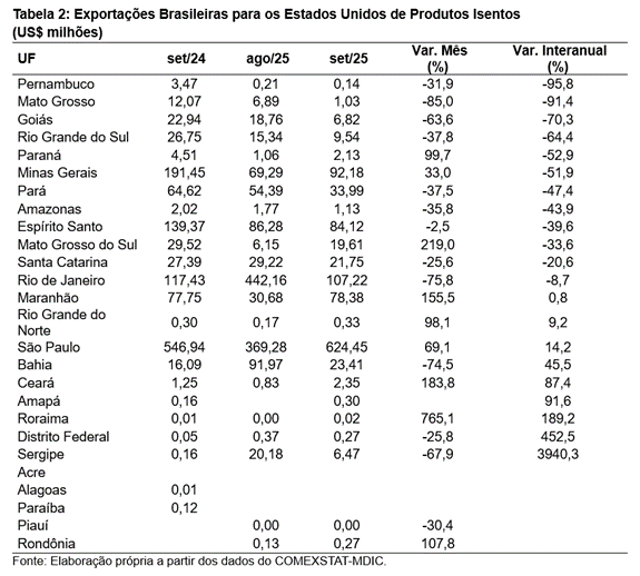 Pode-se perceber que os produtos isentos podem ser decisivos em amortecer as variações observadas. Onde os isentos são grandes e cresceram, como em São Paulo e, em menor grau, em Ceará e Bahia, eles seguraram a queda dos não isentos e evitaram um tombo no total. Onde até os isentos caíram, principalmente no Sul e em Minas, a queda dobrou no agregado. A cronologia ajuda, mas não explica tudo haja vista que a antecipação de embarques em julho/agosto pode explicar também parte da queda de setembro (caso do Rio de Janeiro), mas não a persistência das perdas no Sul e em MG. Nesses casos, há sinais de pressões estruturais: tarifa, disputa de preços e troca de fornecedores pelos compradores nos EUA. Há, entretanto, contrapontos interessantes: Ceará e Goiás demonstram que é possível reconfigurar rapidamente o mix e crescer até no núcleo não isento, explorando nichos menos sensíveis e ganhos de competitividade logística e comercial.