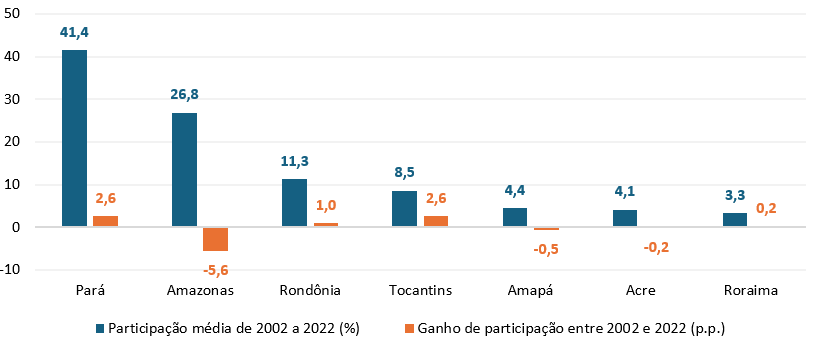 A economia da região Norte, na média de 2002 a 2022, foi bastante concentrada nos estados do Pará e do Amazonas que, juntos, representaram cerca de 65% do valor adicionado total da região.