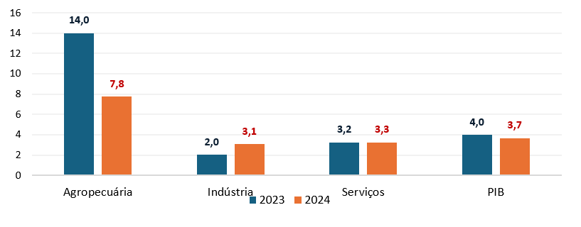 Em 2024, os crescimentos das unidades da federação foram mais homogêneos, variando de 2,8% no Amazonas, até 5,0% no Amapá. Além do Amapá, Rondônia e Acre também apresentaram taxas elevadas (acima de 4,5%). Nos casos de Rondônia e do Acre, cerca de metade de seus crescimentos foi explicada pelo setor de serviços, enquanto no Amapá, este mesmo setor foi responsável por cerca de 70% do PIB.