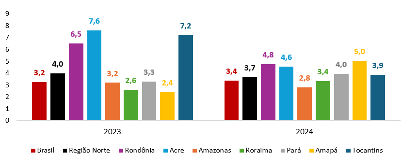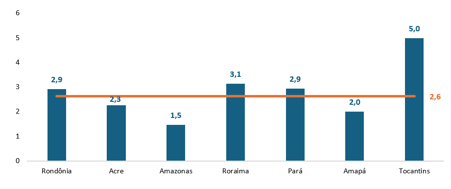 Na análise por UF, apresentada no Gráfico 5, notam-se estimativas acima da média regional (2,6%) e nacional (2,5%) para quatro estados: Tocantins (5,0%), Roraima (3,1%), Rondônia (2,9%) e Pará (2,9%).