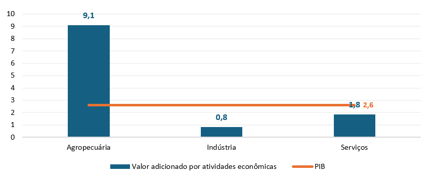 Na análise para o 1º semestre de 2025, o IBGE divulgou que o PIB brasileiro cresceu 2,5%, em relação ao 1º semestre de 2024. Estima-se que o PIB da região Norte tenha tido crescimento similar no período (2,6%). Conforme apresentado no Gráfico 4, mais uma vez a agropecuária teve papel de destaque, sendo a de maior crescimento entre as três grandes atividades econômicas.