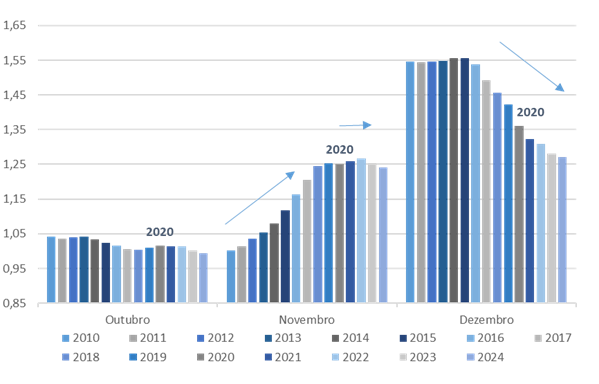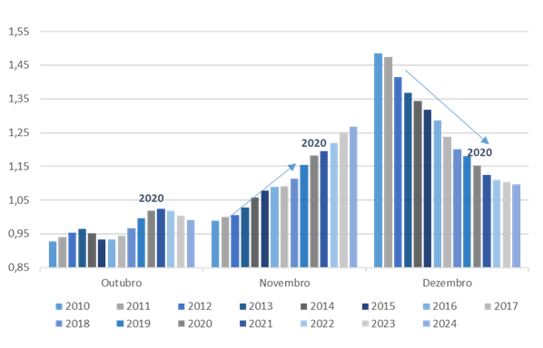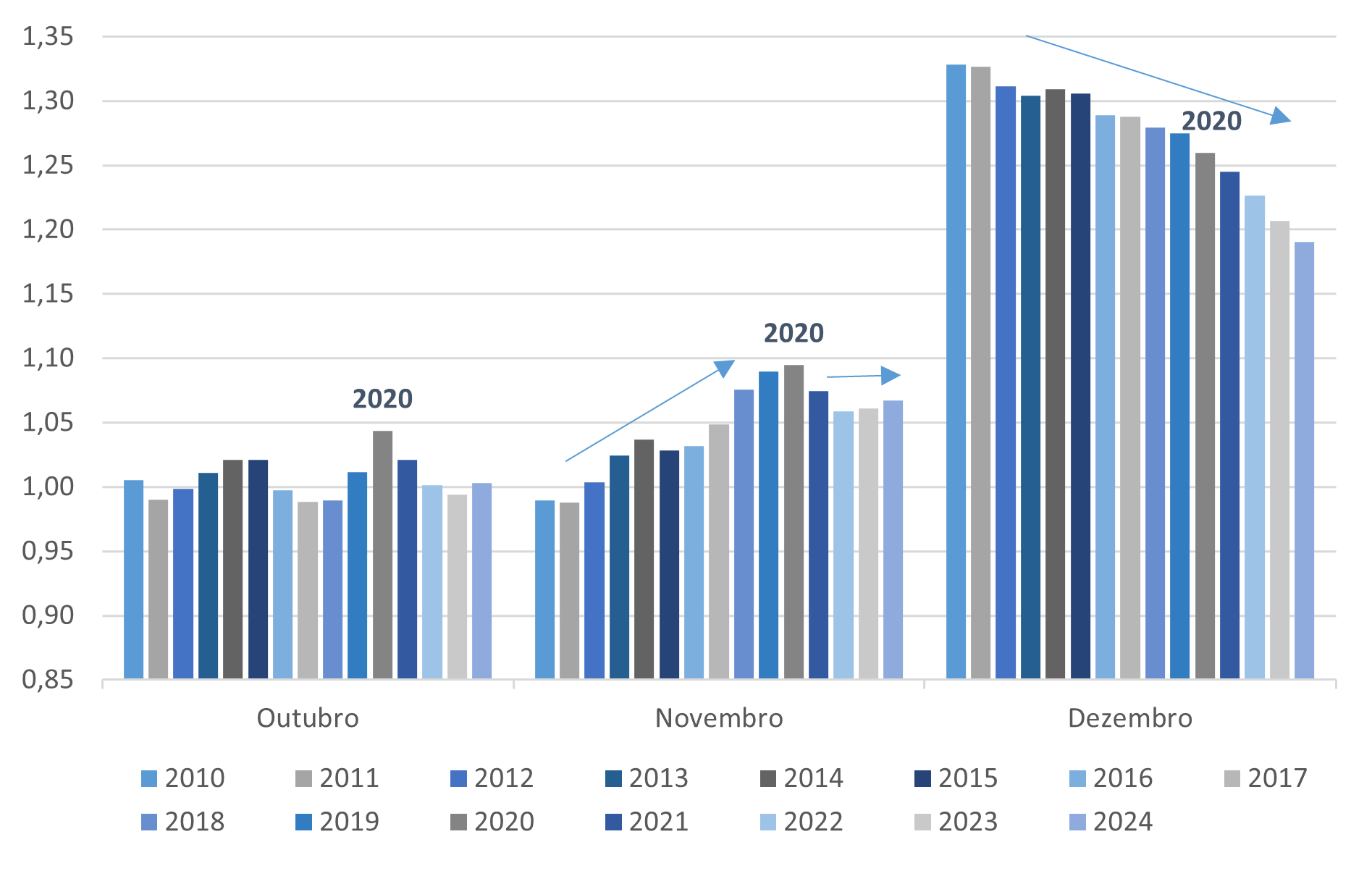 Nos primeiros anos da série, entre 2010 e 2015, o comportamento era o esperado para o varejo antes da Black Friday: outubro e novembro tinham fatores próximos de 1,00, indicando um padrão similar ao padrão médio dos 12 meses do ano. Já o mês dezembro apresentava o pico de vendas, com fatores em torno de 1,33, indicando um volume de vendas 30% superior à média. O consumo de fim de ano se concentrava fortemente nas compras de Natal.