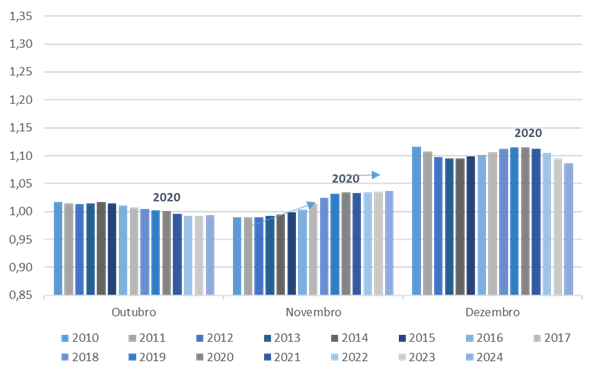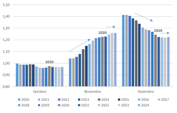Gráfico 1 – Fatores sazonais do varejo restrito (PMC) para outubro, novembro e dezembro - 2010 a 2024