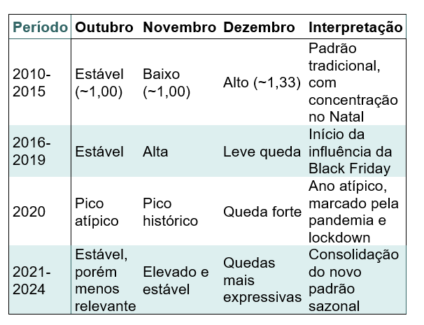 De 2021 a 2024, comércio em novembro permanece mais forte do que no período pré-2016, enquanto dezembro segue abaixo do antigo pico, e outubro não recupera relevância anterior, indicando que parte da demanda migrou definitivamente para novembro.
