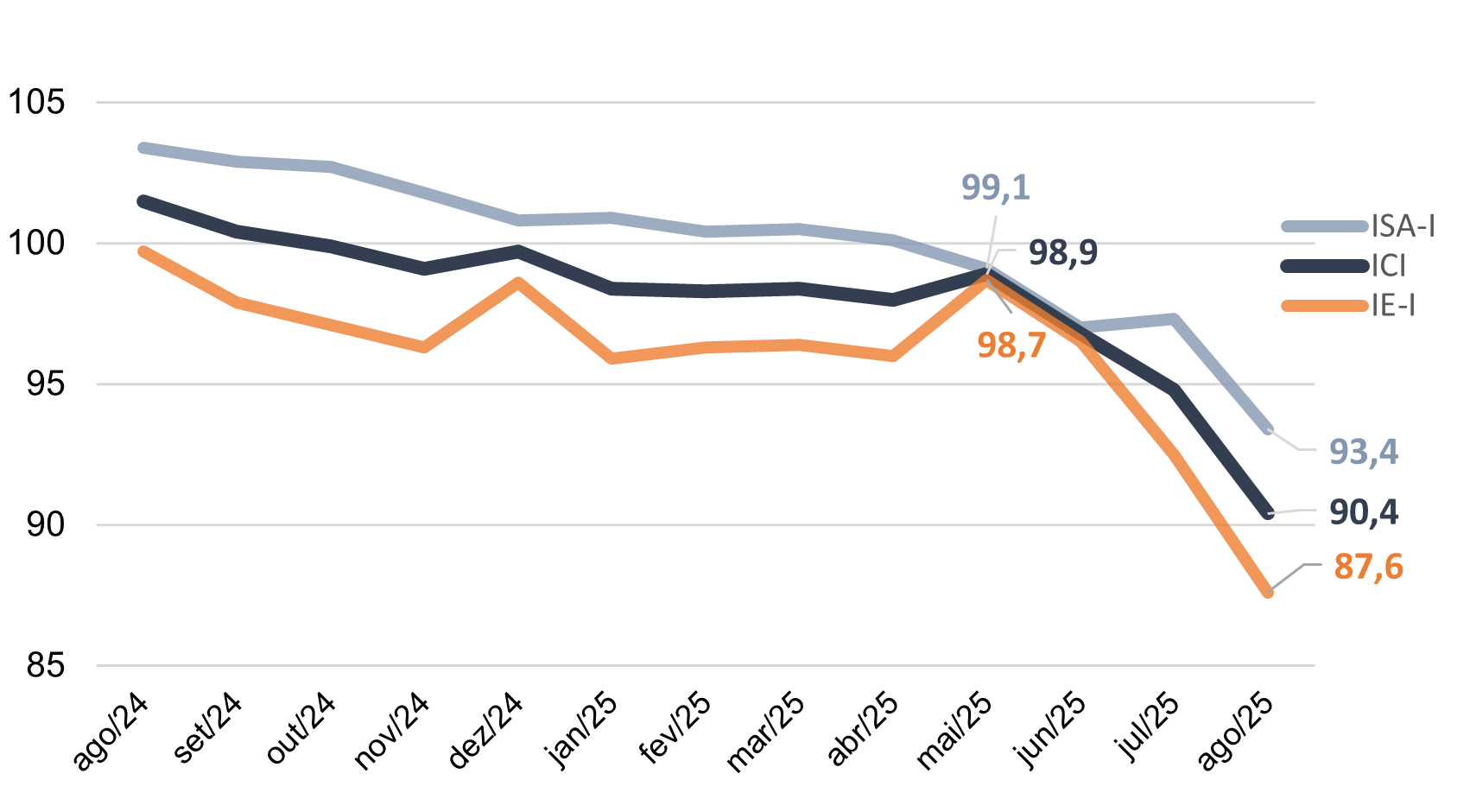 O Índice de Confiança da Indústria (ICI) recuou 4,4 pontos em agosto, reforçando tendência iniciada em junho, sob influência de um cenário macroeconômico complexo, com juros elevados, aumento da incerteza e contração da demanda. Pelo lado das expectativas para os próximos meses, o quadro é ainda mais preocupante. Desde maio, a piora recorrente das expectativas levou o Índice de Expectativas da Indústria a recuar em agosto para 87,6 pontos, o pior resultado desde junho de 2020, durante a pandemia de covid-19.