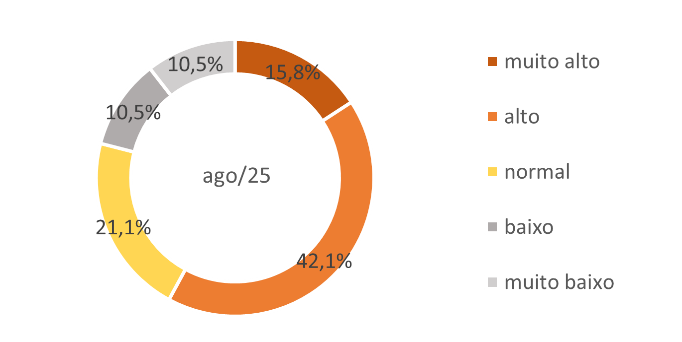 Quase 60% das empresas mapeadas afirmam ter sido impactadas pelas turbulências na relação entre Estados Unidos e Brasil. A partir de maio, há gradual deterioração do sentimento do empresário, acentuada em julho e agosto.