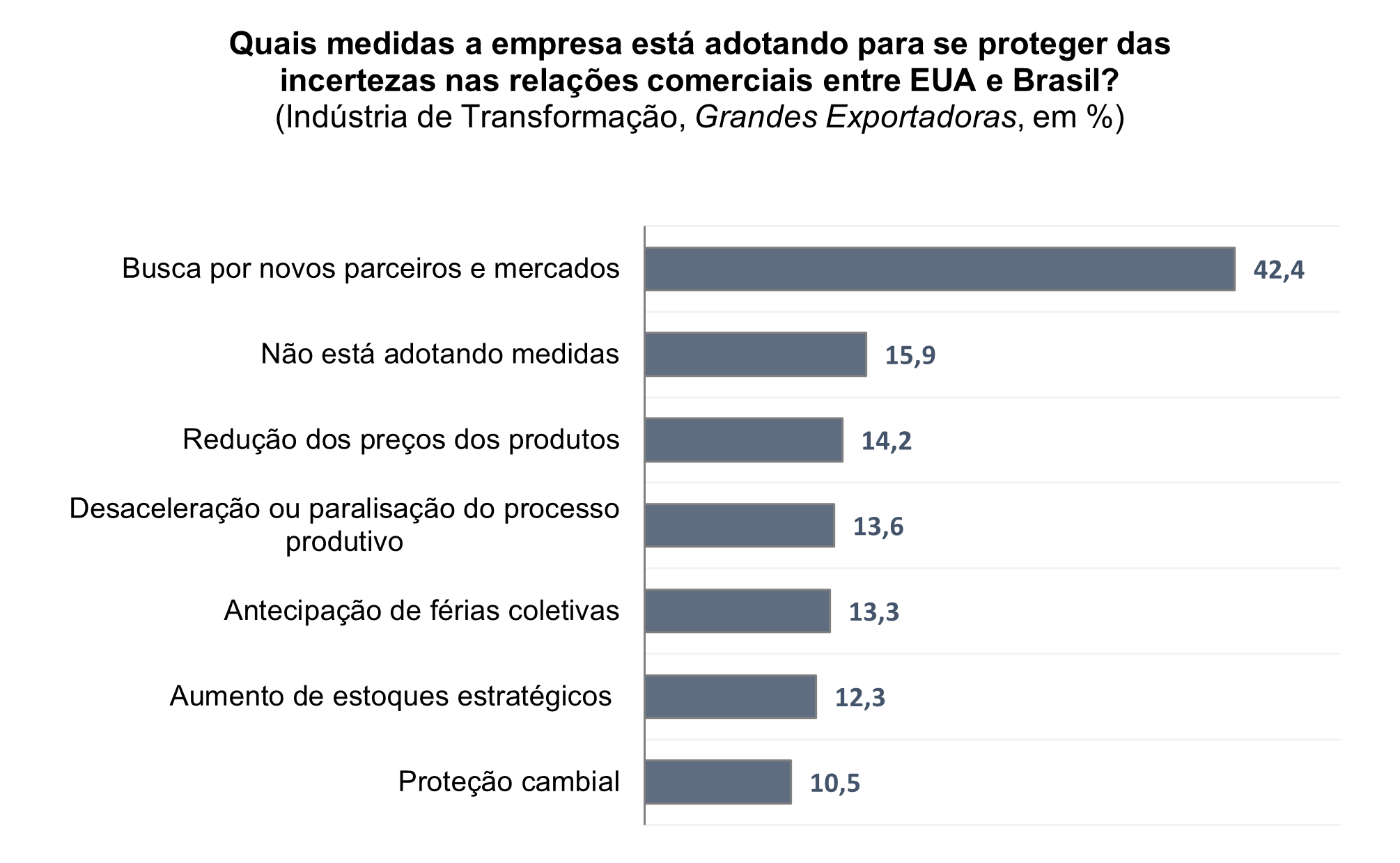 Exportadoras apontam para mais impacto nos próximos meses, e as medidas adotadas para se proteger dessas incertezas variam. O gráfico acima elenca as medidas mais marcadas.