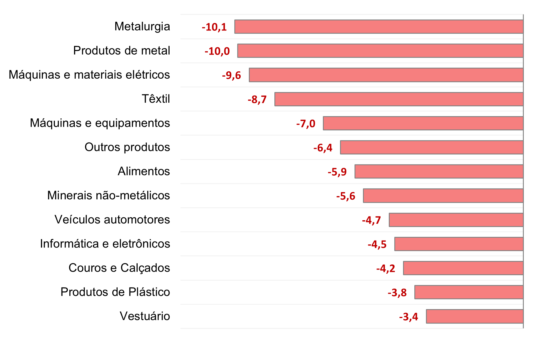 O impacto, quando analisado individualmente em nível de produto, pode não parecer muito grande, visto que muitos produtos não ultrapassaram a marca de US$ 1 bilhão em valor total de exportação para os Estados Unidos em 2024. Apesar disso, o sentimento de insegurança com os rumos do setor chega a um patamar historicamente elevado, indicando expectativa de desaceleração da atividade futura dos negócios disseminada entre os setores, e apenas intensificada pelas tarifas. O gráfico abaixo detalha a queda no IE-I por segmento entre julho e agosto.