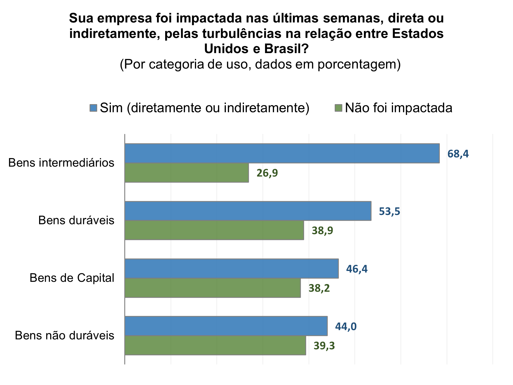 Na ótica das categorias de uso, os Bens Intermediários são os que mais apontam um impacto já presente. Cerca de 68% das empresas que produzem esses bens indicam impacto direto ou indireto. É nessa categoria que se enquadram produtos de metalurgia, como o ferro fundido bruto e produtos semimanufaturados de ferro ou aço não ligado, utilizados pela indústria manufatureira dos Estados Unidos e tributados desde o início do Liberation Day. Além destes, resinas, soja e outros produtos produzidos pela indústria alimentícia também estão presentes nessa grande categoria. O gráfico acima detalha o impacto por categoria de uso.