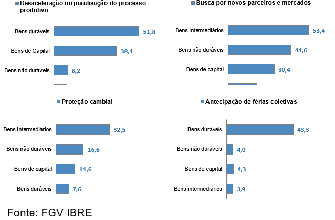 Em menor proporção algumas estratégias, como o aumento de estoques estratégicos, desaceleração da produção e redução no preço, surgem como opções mais imediatas e já estão sendo utilizadas por cerca de 12% a 15% das empresas. A escolha específica por cada uma dessas alternativas, ou a combinação entre elas, depende das características de cada segmento, da natureza dos produtos produzidos e da dinâmica de parceiros comerciais das empresas respondentes.