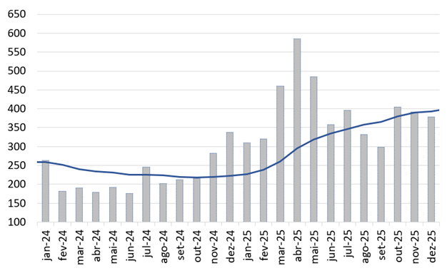 Em 2025, ataques às instituições e mudanças nas regras do jogo aumentaram incerteza. 2026 terá instabilidade institucional e alta da incerteza antes das eleições legislativas nos EUA. Hiperatividade da administração Trump turva visibilidade prospectiva.