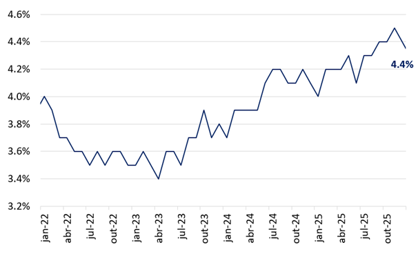 Há sinais de que o mercado de trabalho americano migrou para um novo equilíbrio, mais frágil. Entre 2024 e 2025, a média mensal de geração de novos postos de trabalho não agrícolas (non-farm payroll) reduziu de 186 mil para 15 mil, já incorporando a mais recente revisão anual das estatísticas. Indicadores alternativos do mercado de trabalho, como aqueles ligados às taxas de rotatividade e contratações, estão em patamares comparáveis aos observados durante a pandemia da Covid-19. Ainda assim, o aumento da taxa de desemprego foi bastante moderado, saindo de 4,1% em 2024 para 4,4% em 2025 (gráfico 2).
