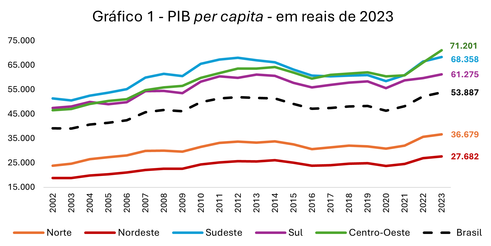 No caso brasileiro, o PIB per capita em 2023 foi de R$ 53.887, tendo havido grande variação de nível entre as regiões do país, como apresentado no gráfico 1. As regiões Nordeste, com R$ 27.682, e Norte, com R$ 36.679, apresentaram valores inferiores ao da média nacional, enquanto o Centro-Oeste, com R$ 71.201, o Sudeste, com R$ 68.358 e o Sul, com R$ 61.275, apresentaram patamares superiores ao da média brasileira.