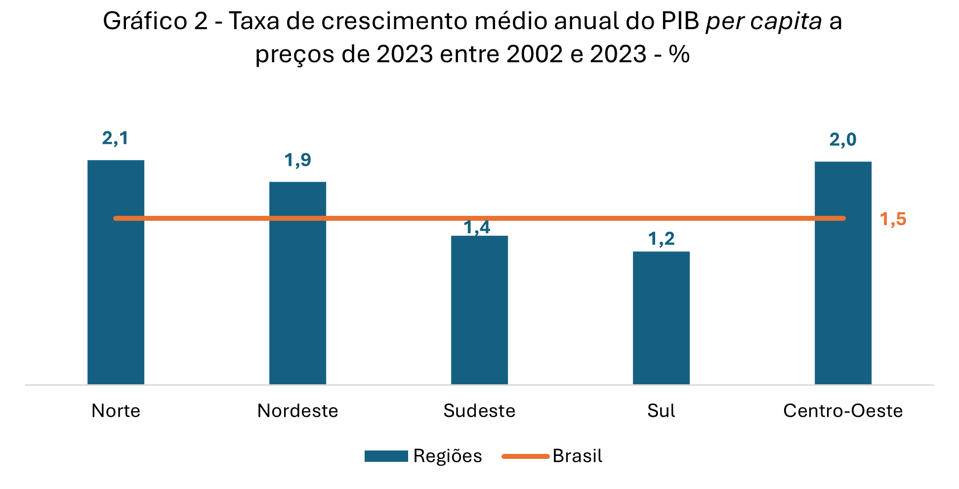 Apesar desse fator estrutural, que contribui para que o Sudeste e o Sul tenham níveis mais elevados de PIB per capita que o Norte e o Nordeste, tem havido redução das diferenças entre as trajetórias dessas regiões. Isto é explicado pelo fato de o PIB per capita ter registrado taxa média anual de crescimento entre 2002 e 2023 maior no Norte e no Nordeste do que as observadas no Sul e Sudeste, como mostra o gráfico 2. Nota-se que os maiores crescimentos foram do Norte, do Centro-Oeste e do Nordeste do país, enquanto o Sudeste e o Sul apresentaram taxas de crescimento abaixo da média nacional.