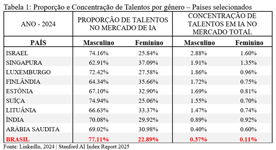 Esse artigo destaca que o Brasil enfrenta um paradoxo haja vista que é um dos países mais avançados da América Latina em infraestrutura e crescimento de talentos em Inteligência Artificial, mas, ao mesmo tempo, apresenta o maior desequilíbrio de gênero entre 48 nações analisadas. O indicador elaborado a partir dos dados do Stanford AI Index Report 2025 e do LinkedIn evidencia que o engajamento feminino na área é significativamente inferior ao masculino, o que ameaça ampliar desigualdades históricas e limitar o potencial inovador do país.