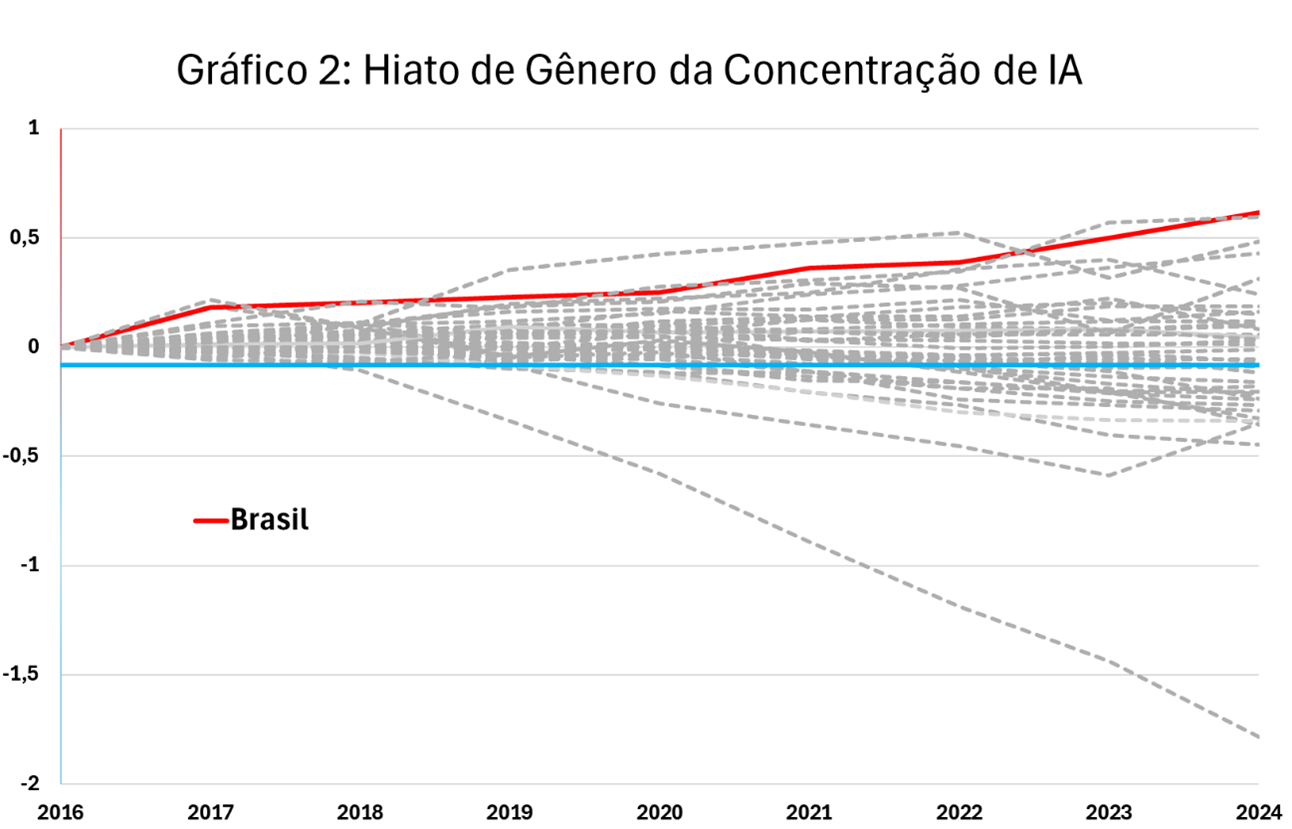 Como no período inicial (2016) a maioria dos países já revela um maior engajamento dos homens, a trajetória desejável para o HGC-IA seria uma convergência gradual para um valor menor do que zero. Esse valor menor do que zero seria uma correção natural do viés inicial observado a favor dos homens. Não existe, porém, um “alvo” universal e permanente para esse equilíbrio. Por isso, adotamos como referência pragmática a média entre países no período mais recente (-0,081), indicada pela linha horizontal azul no gráfico. De modo geral, países que se aproximam desse patamar sinalizam uma melhoria em termos de diversificação, pois estariam corrigindo o viés observado inicial em favor do engajamento masculino; aqueles que se afastam em valor absoluto sugerem agravamento do desequilíbrio.