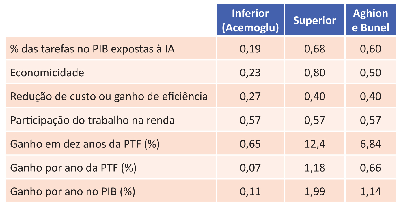 Nas primeiras quatro linhas da tabela temos os quatro passos para calcular o impacto da IA sobre a produtividade total dos fatores. As estimativas já são para os ganhos em dez anos. O impacto sobre a produtividade é sobre a produtividade total dos fatores pois estamos considerando o estoque de capital e a escolaridade média da população fixados. Na penúltima linha temos o resultado da multiplicação dos valores (para uma mesma coluna) nas primeiras quatro linhas, multiplicado por 100 (para termos o resultado em percentagem). A estimativa de Acemoglu (primeira coluna), que representa o limite inferior para Aghion e Bunel, é que o ganho em 10 anos será de 0,65% ou 0,07% por ano. Na segunda coluna, temos o limite superior, segundo Aghion e Bunel. Na terceira coluna, encontra-se a estimativa que Aghion e Bunel consideram a mais certeira.