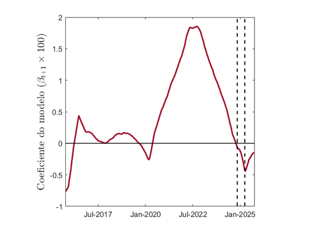 Valores positivos representam apreciação (fortalecimento) do dólar, enquanto valores negativos indicam o movimento oposto — depreciação (enfraquecimento). As linhas verticais tracejadas destacam duas datas: a primeira, o dia da eleição de Donald Trump. Nota-se que a mudança de sinal ocorre já em novembro de 2024, e não apenas no chamado Liberation Day — data marcada pela segunda linha tracejada —, que representa o ápice, do ponto de vista quantitativo, do efeito negativo da aversão ao risco sobre o dólar.