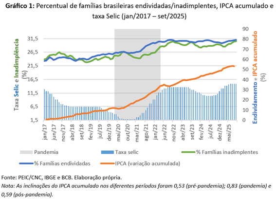 A crise sanitária de 2020–2022 colocou o crédito às famílias no centro do debate macroeconômico. O que antes parecia um equilíbrio, com endividamento e inadimplência variando em faixas relativamente estáveis, cedeu lugar a uma nova dinâmica moldada por choques simultâneos de inflação, juros e renda. Estudar esse fenômeno é crucial porque o endividamento e a inadimplência podem sufocar — e, em casos extremos, colapsar — o consumo das famílias, componente dominante da demanda agregada que responde por cerca de 62% do PIB brasileiro. Os Gráficos 1 e 2, abaixo, sintetizam essa transição: entre 2017 e meados de 2025, o país atravessou três regimes distintos — pré-pandemia, colapso pandêmico e recomposição pós-choque —, cada qual com efeitos específicos sobre o orçamento das famílias.