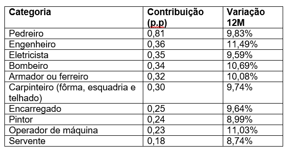 Até setembro, o grupo Mão de Obra no INCC acumulava 9,88% em 12 meses. Entre os profissionais técnicos, como bombeiros, eletricistas e pedreiros, as elevações médias foram de 10,04%. Já entre os especializados, como engenheiros e mestres de obra, as altas chegaram a 9,55%.