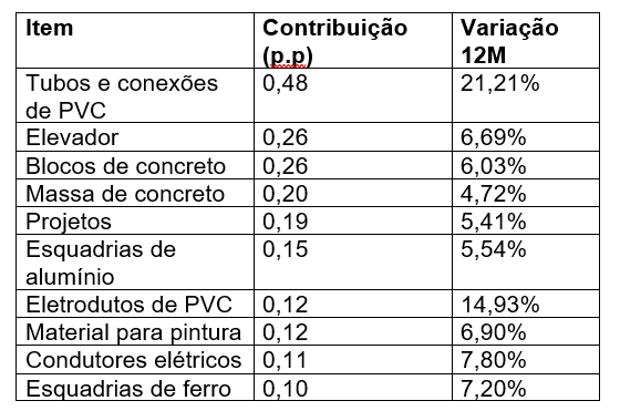 Entre os materiais, sobressaem-se itens estruturais à base de cimento e concreto — massa de concreto, blocos de concreto e cimento Portland comum — e os vergalhões e arames de aço ao carbono, que isoladamente respondem por quase 6% da ponderação total.