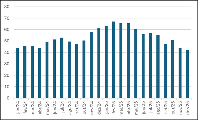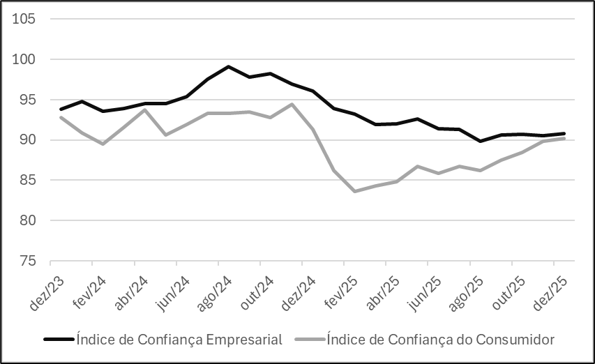Em síntese, os Índices de Confiança, tanto empresarial quanto do consumidor, indicam que o início de 2026 deve ser um pouco menos desafiador do que o observado ao longo de 2025. Os quesitos de expectativa fecharam o ano em alta, e eles costumam antecipar movimentos nas percepções de demanda em alguns meses, ou seja, indicando que podemos ver uma melhora da atividade. É esperado que o cenário macroeconômico melhore, com possibilidade de redução de juros e inflação dentro da meta, o que pode gerar efeitos positivos na confiança. Além disso, medidas de estímulo são esperadas e devem gerar aumento no poder de consumo dos brasileiros. Por outro lado, por ser um ano eleitoral, é esperada alguma volatilidade, especialmente se houver aumento da incerteza.