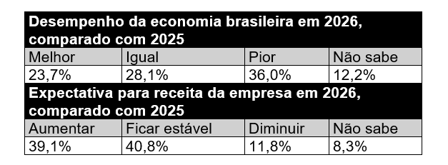 Já no segundo quesito, a maioria das empresas espera um ano com faturamento maior. No agregado, 39,1% das empresas esperam auferir aumento de receita em 2026, e apenas 11,8% indicam que devem ter receitas menores. No varejo, foi observado o maior percentual de empresas otimistas (42,7%) e, na construção, o resultado foi mais pessimista, com 15% das empresas prevendo receitas piores do que as observadas em 2025.
