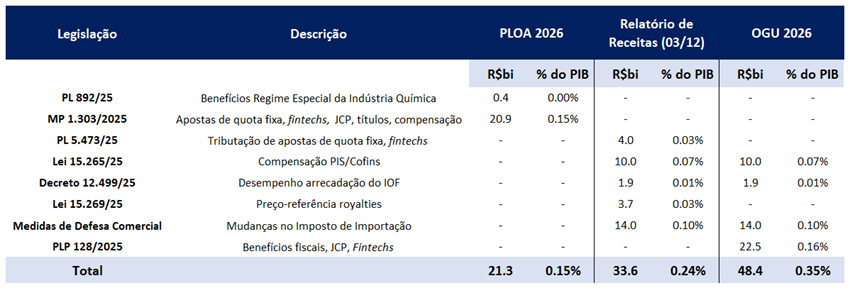 Para o PLOA 2026, as preocupações vão além do debate entre a meta ou o piso da banda de tolerância; atingir esse piso está sob risco. Na apresentação do PLOA (em agosto), a divergência entre as projeções de receita do mercado e a oficial era de cerca de R$80,0 bi (em termos líquidos)[3]. O cenário se agravou sem a MP 1.303/25, mas as questões foram parcialmente resolvidas por um conjunto de medidas de última hora, com foco nas receitas, com destaque para o Projeto de Lei Complementar (PLP) 128/25 (aprovado no Congresso e esperando sanção presidencial) e para o aumento do Imposto de Importação. A essas se somou a limitação das compensações tributárias de PIS/COFINS (Lei 15.265/25), compondo um conjunto de iniciativas que passou a sugerir receitas, no Orçamento de 2026, acima do originalmente projetado na PLOA. Note-se que no Relatório de Receitas do PLOA (03/12/2025), o escopo de medidas aprovado foi levemente distinto; ao fim, a arrecadação bruta no Orçamento de 2026 será R$27,1 bi (0,2% do PIB) superior ao originalmente previsto (tabela 1).