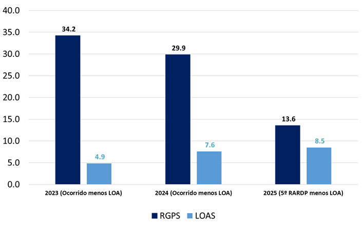 Gráfico 1: Diferença das despesas de RGPS e LOAS entre execução orçamentária e Orçamento anual (R$ bilhões)