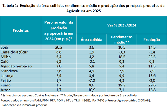 Em 2025, o rendimento médio da maioria das principais culturas no país registrou crescimento, com destaque para o milho e a soja (ver tabela 1). Esse resultado foi alcançado, em grande medida, graças a condições climáticas positivas na maioria das unidades da Federação produtoras.