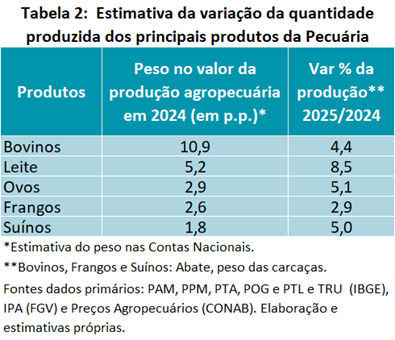 O abate de bovinos tem uma dinâmica própria, devido ao ciclo pecuário — tema ao qual se voltará mais adiante. Porém, mesmo em desaceleração, continuou a apresentar resultados positivos, e nem as tarifas sobre as exportações para os Estados Unidos, que vigoraram durante alguns meses, prejudicaram a atividade: as vendas antes direcionadas para o mercado americano foram transferidas para outros mercados. Assim, a estimativa é de que os abates de bovinos, mensurada em toneladas, atinja uma expansão próxima a 5,5%.