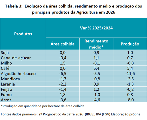 A comparação com a tabela 1 mostra uma situação bem menos favorável que a de 2025, não só no que se refere à produção, mas também ao rendimento médio. Essa deterioração se explica, em primeiro lugar, pela evolução dos preços de vários produtos, que caíram ao longo de 2025: a combinação da boa oferta doméstica e externa, assim como a trajetória do câmbio, diminuíram a rentabilidade de diversas culturas. Além disso, a política monetária “apertada” ao longo do ano passado e o pouco espaço para a concessão de subsídios via Plano Safra afetaram a capacidade (e intenção) de expansão da área plantada, de investimentos e uso de insumos de muitos agricultores, cuja condição financeira já vem se tornando mais difícil há algum tempo.